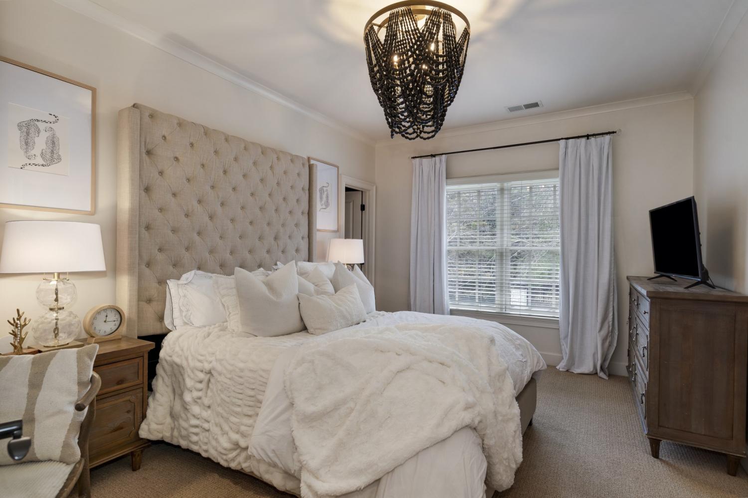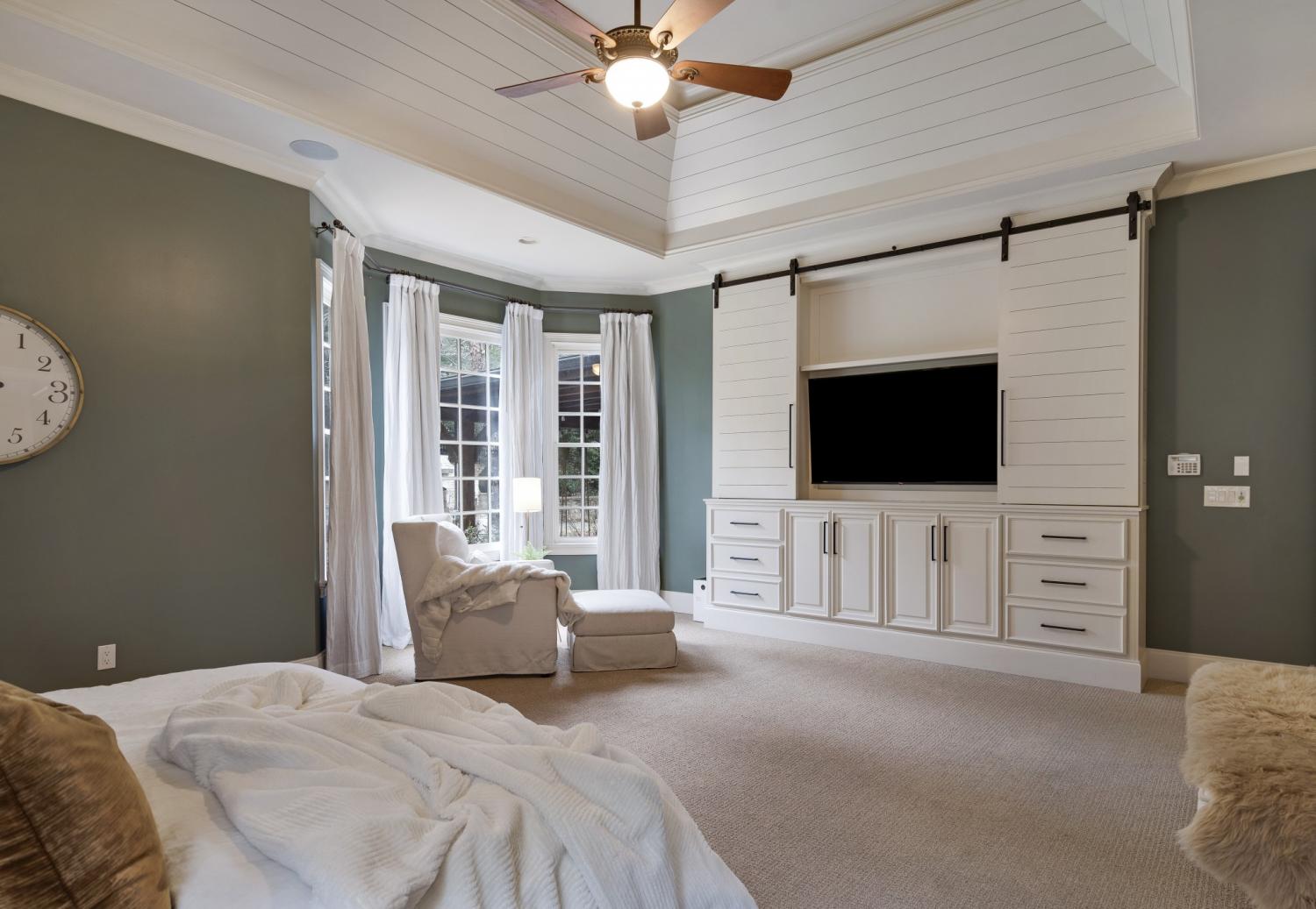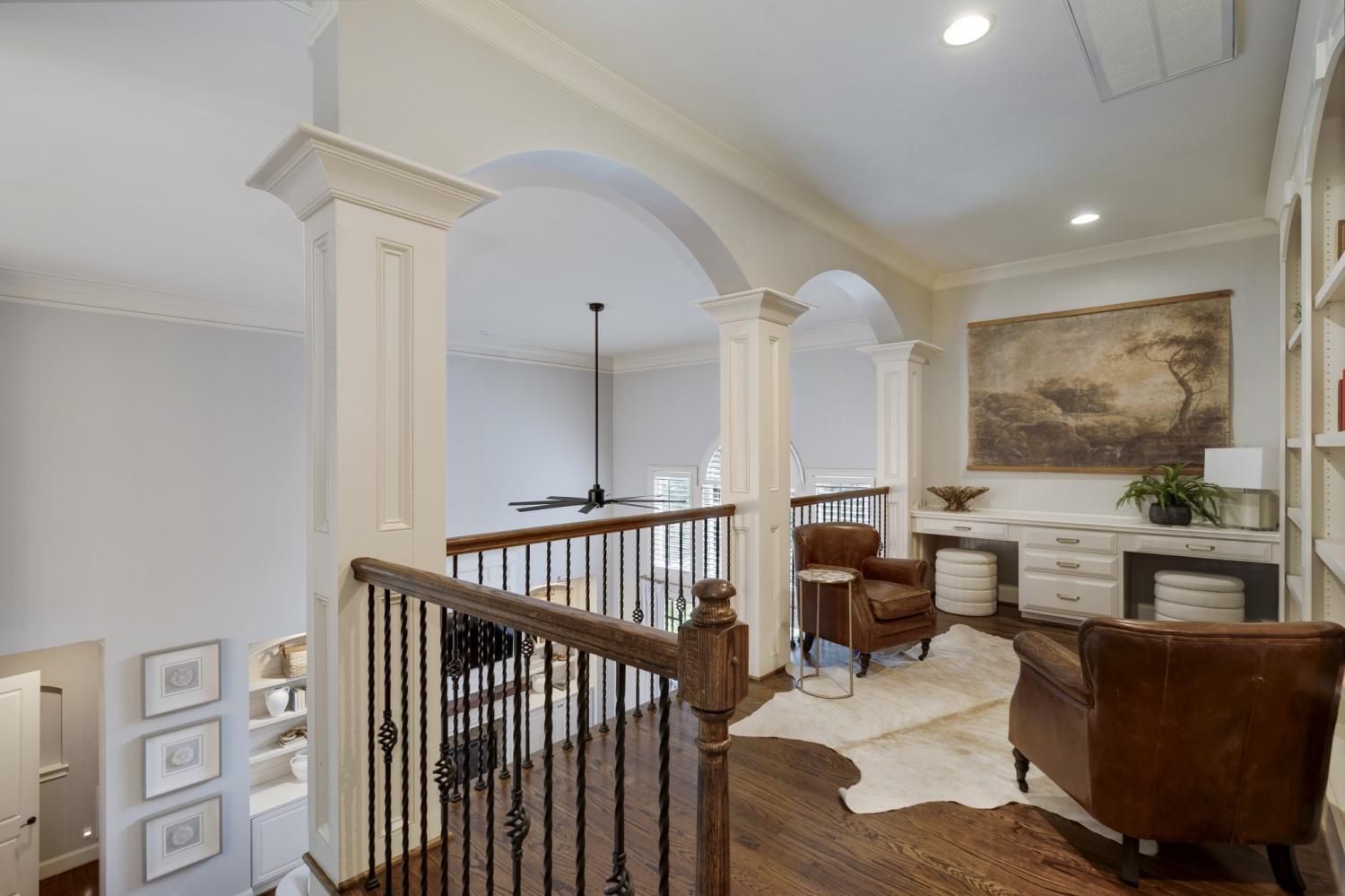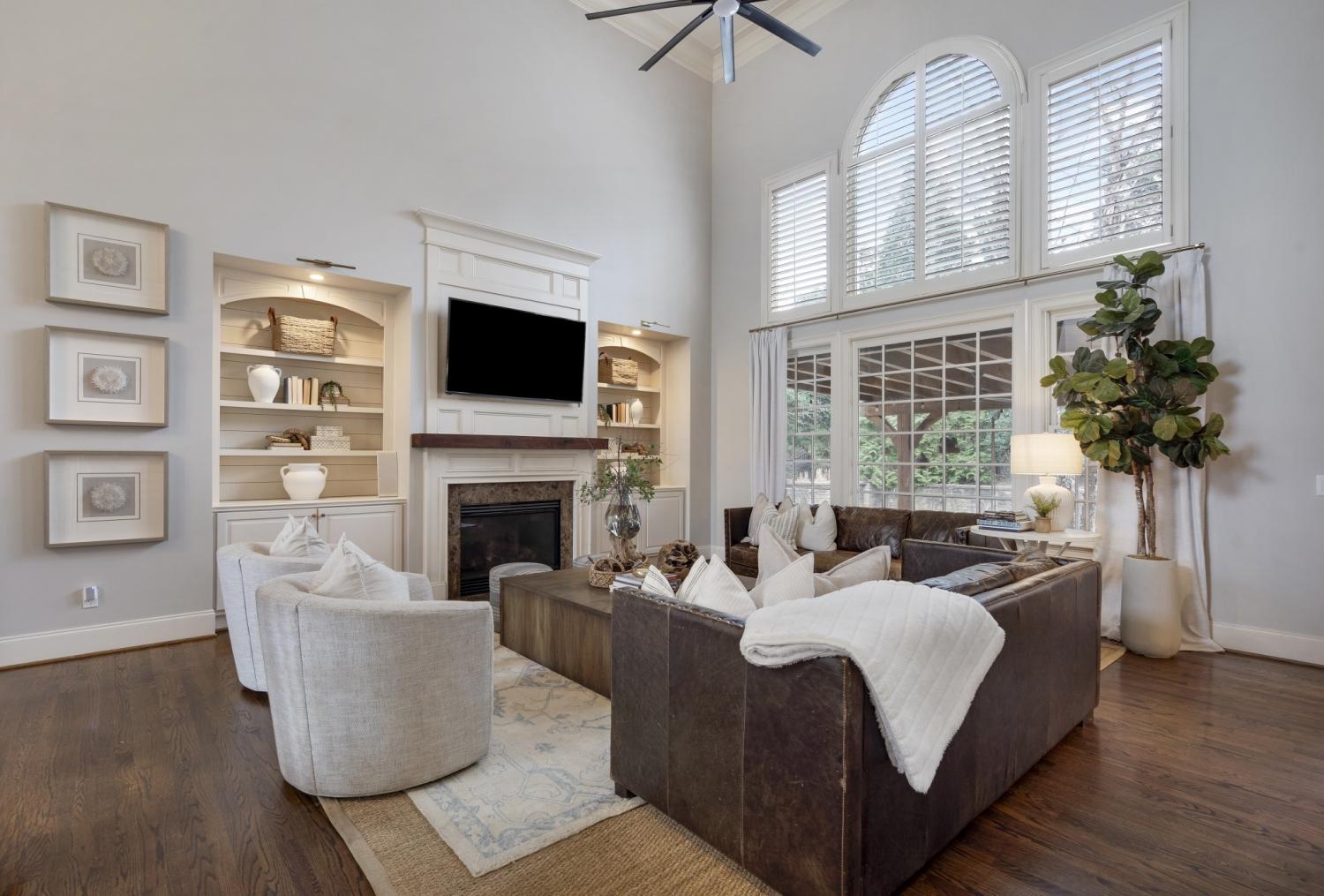 Additional improvements include renovated upstairs baths, new washer and dryer (2023), all toilets replaced (2024), fresh white exterior paint (2024), custom drapery, built-in storage in the primary suite, utility sinks in the laundry and garage, and optional inclusion of mounted TVs.