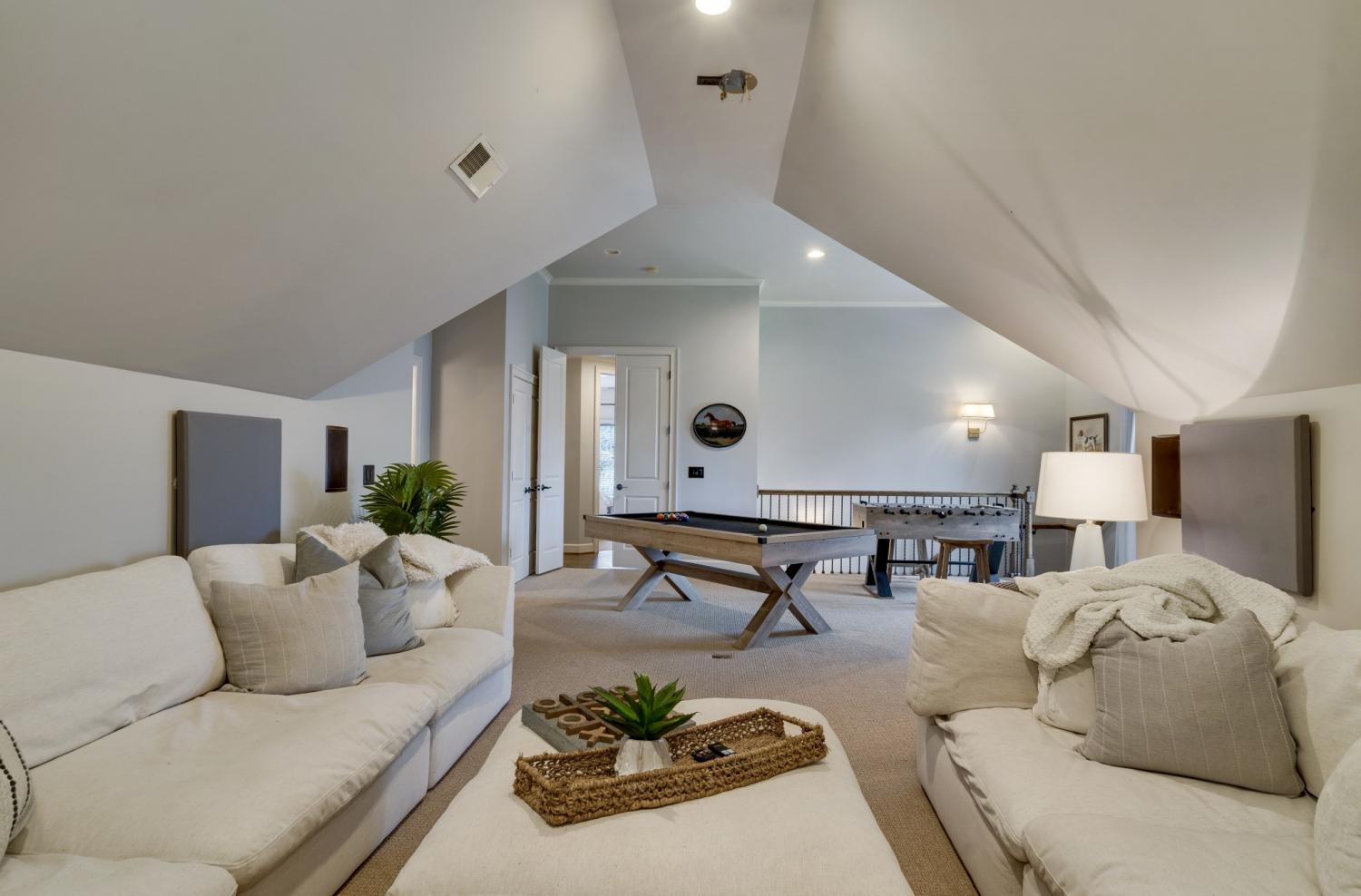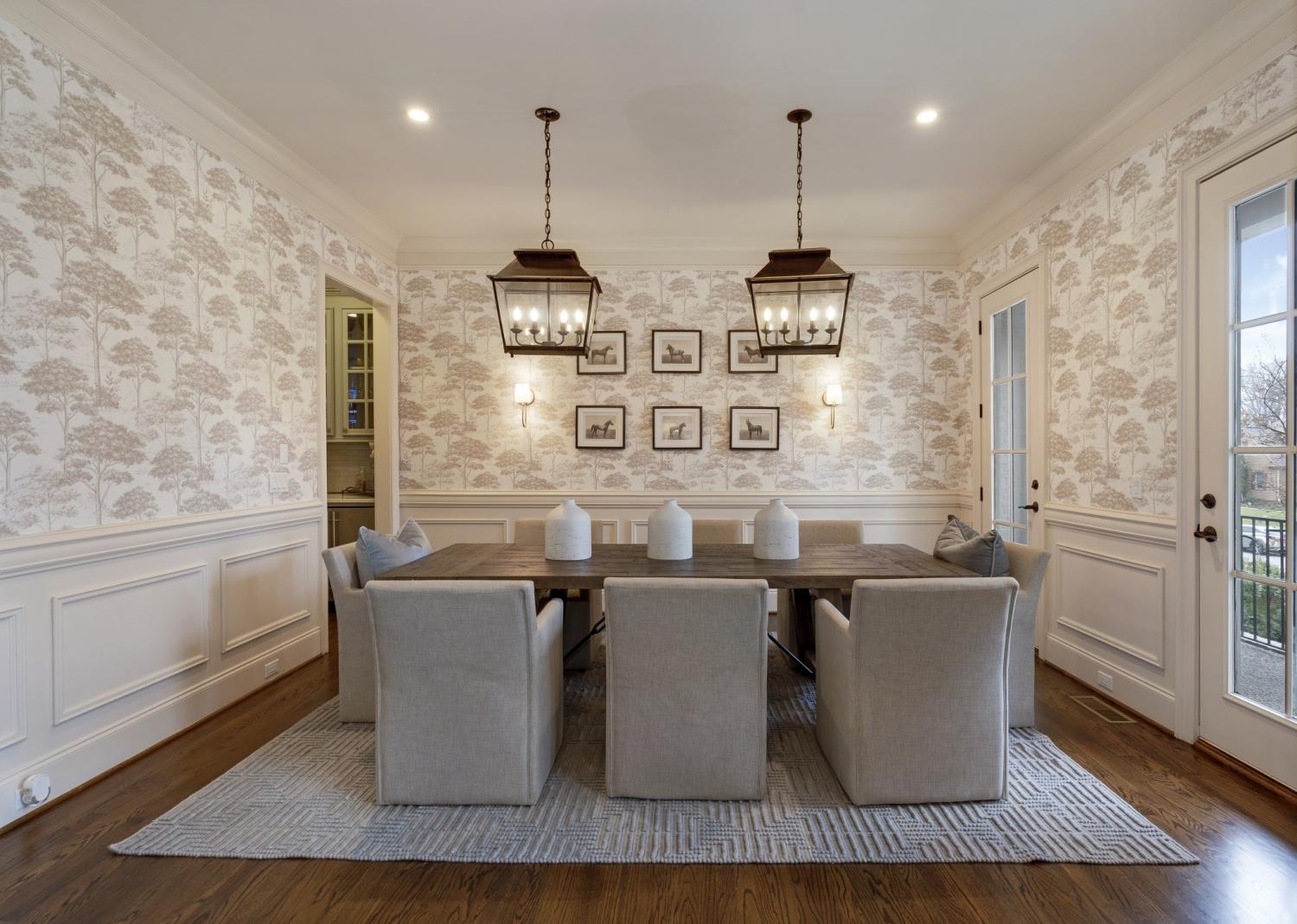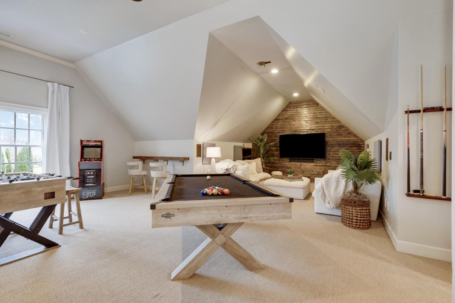 Inside, sophisticated upgrades elevate every room. The media room showcases a striking wood accent wall and an impressive 85” TV that remains with the home. Built-in surround sound flows throughout the interior and backyard, complemented by a fully integrated Google Home system. Designer lighting, custom wallpaper in the dining and laundry rooms, and elegant finishes add style and character throughout.