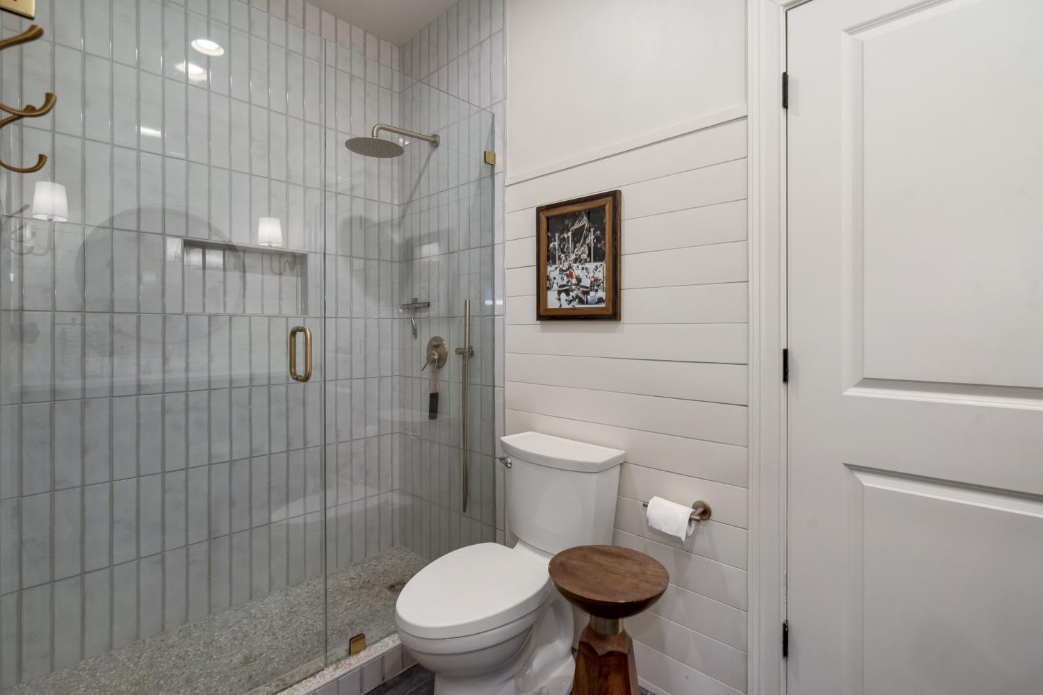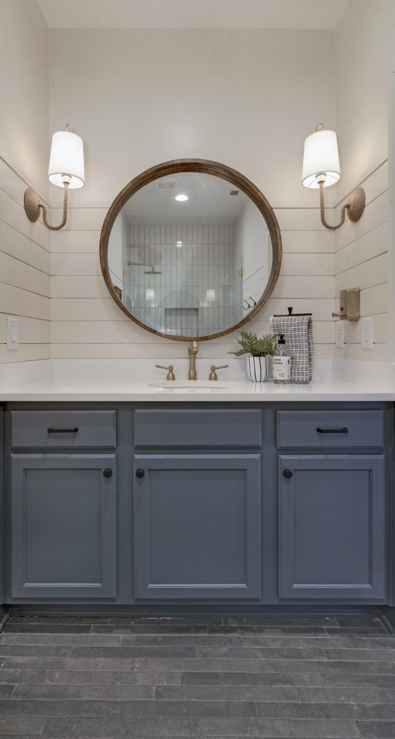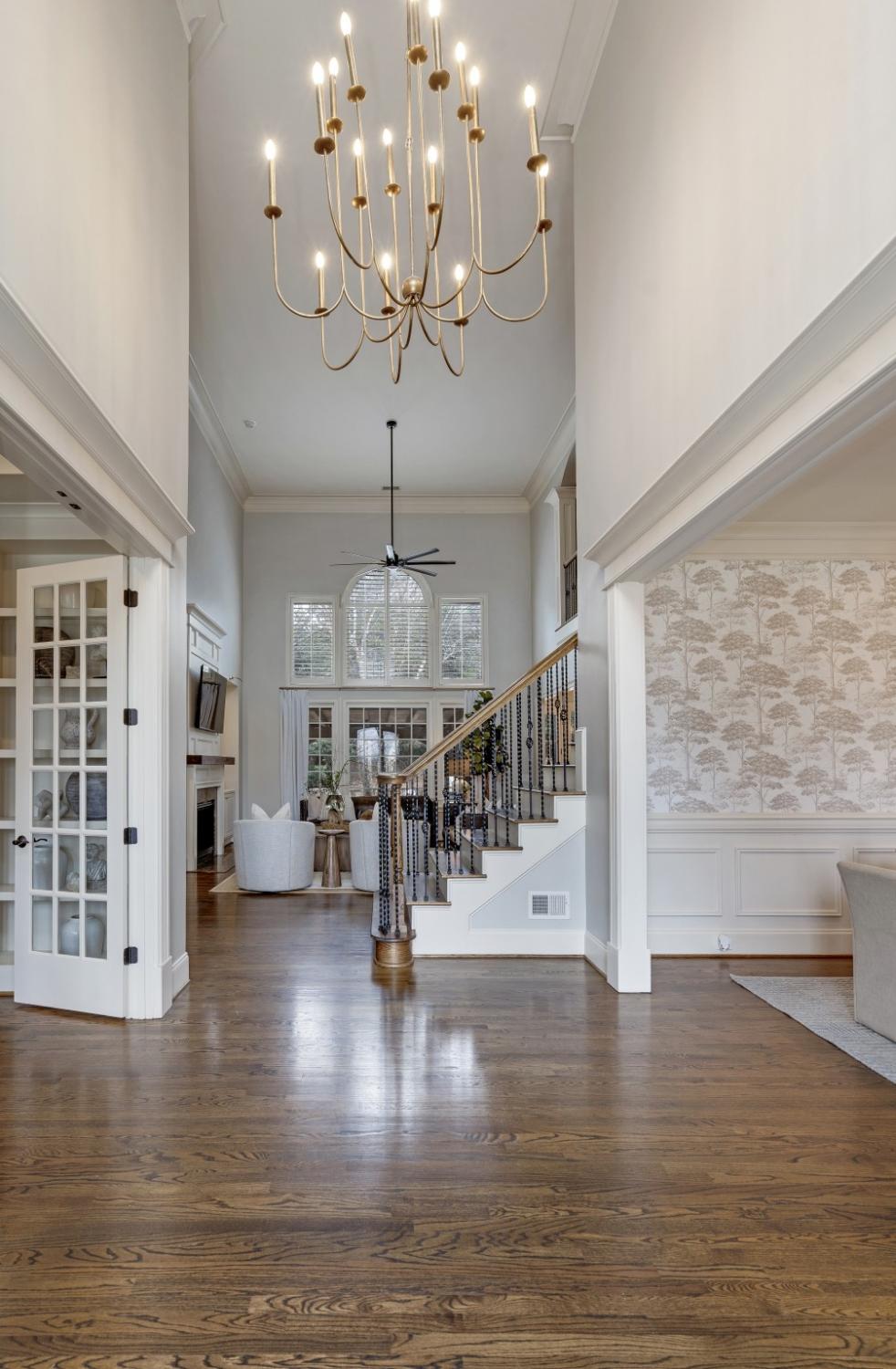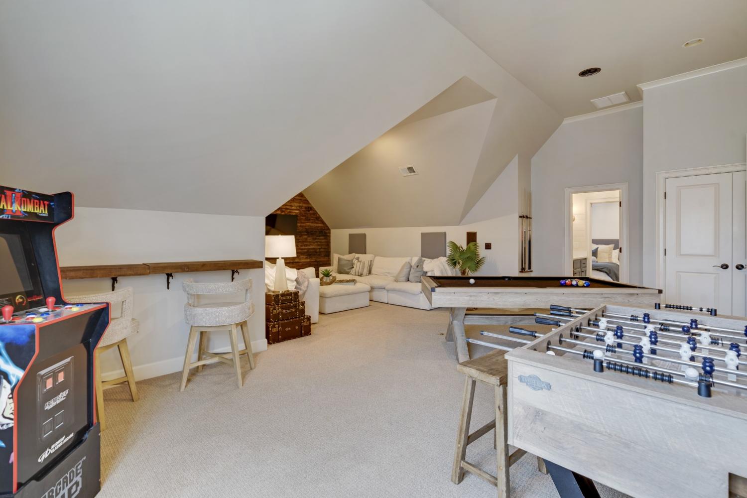 Inside, sophisticated upgrades elevate every room. The media room showcases a striking wood accent wall and an impressive 85” TV that remains with the home. Built-in surround sound flows throughout the interior and backyard, complemented by a fully integrated Google Home system. Designer lighting, custom wallpaper in the dining and laundry rooms, and elegant finishes add style and character throughout.