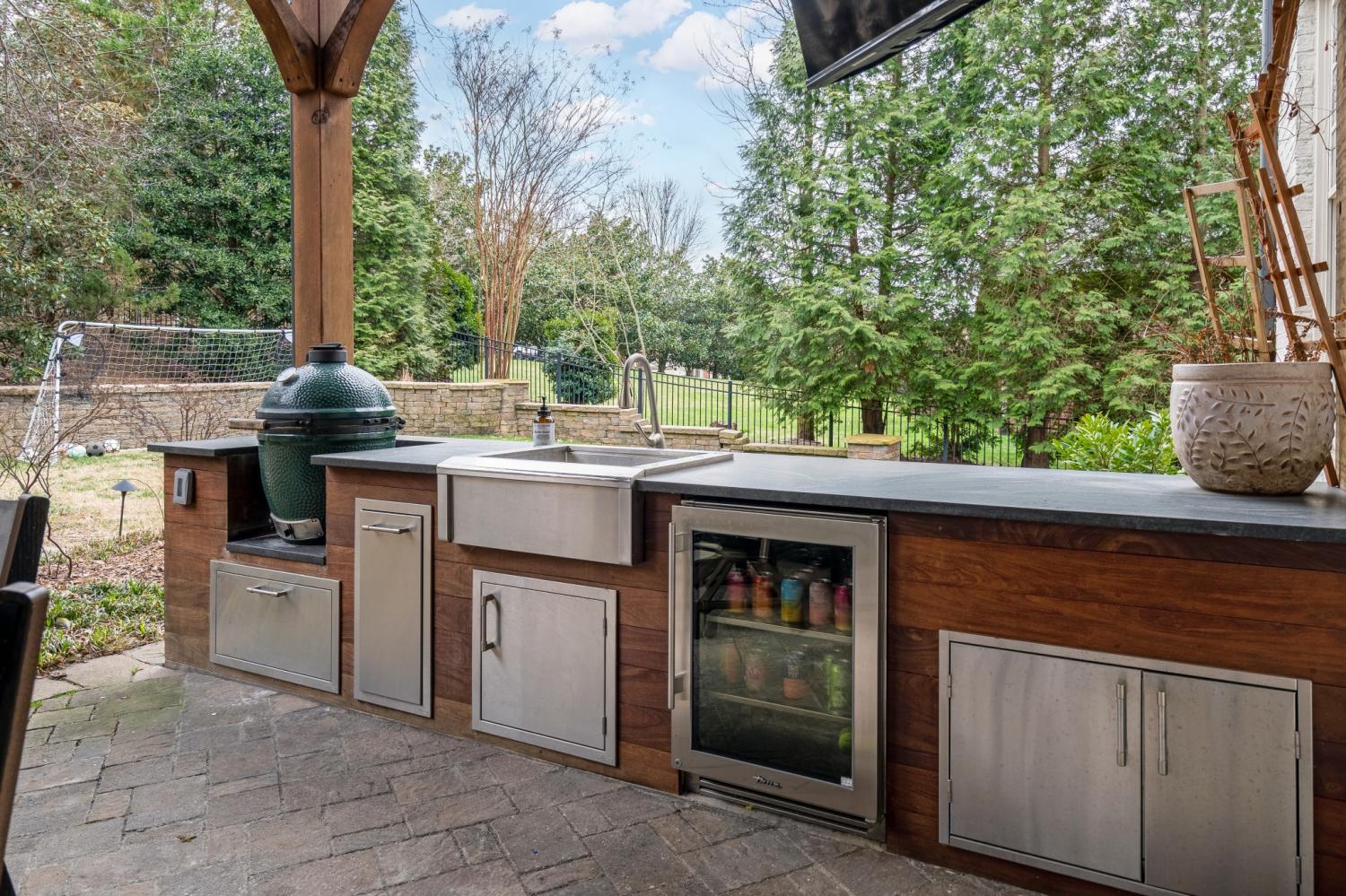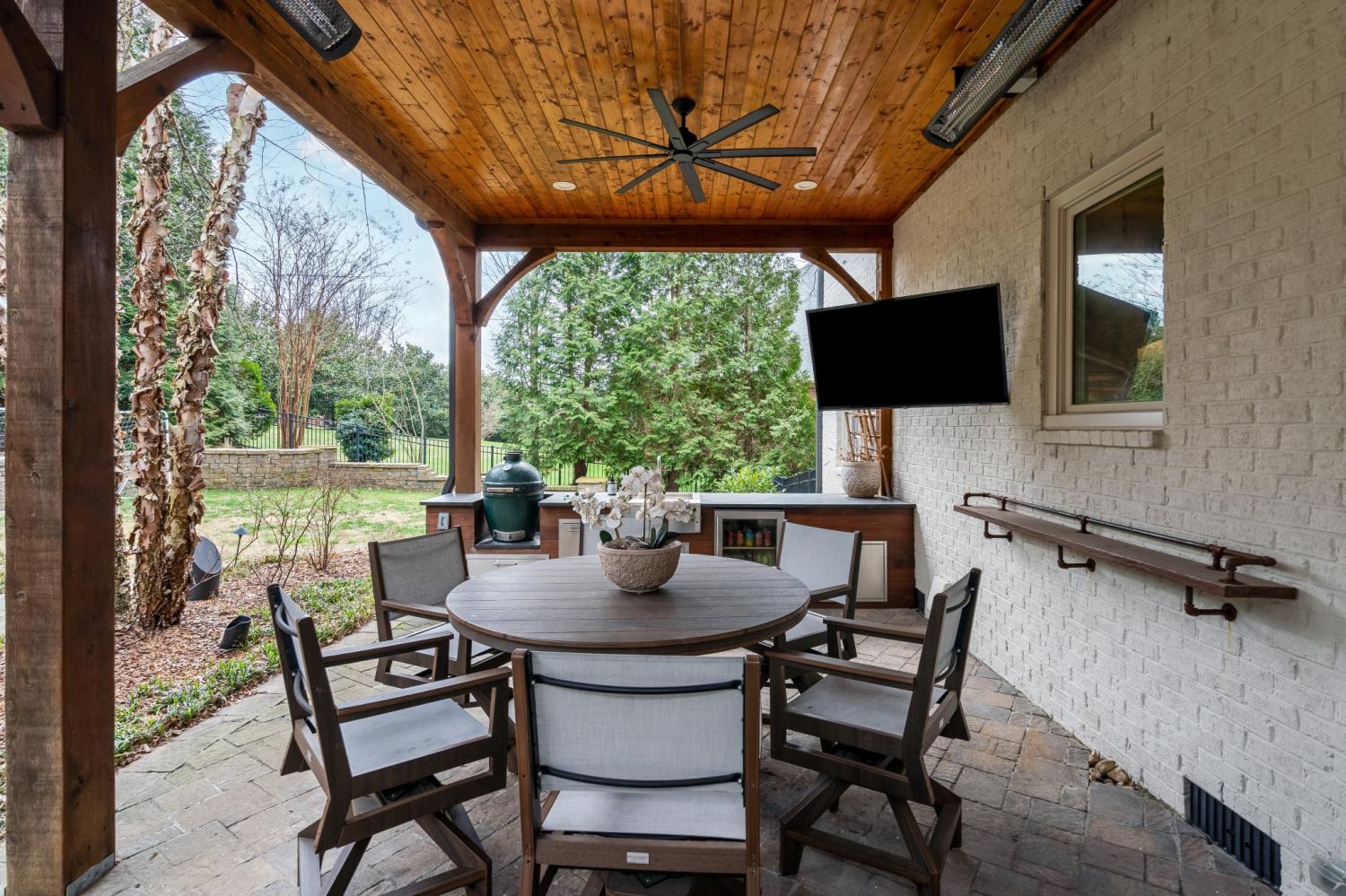 Step into your private backyard retreat, thoughtfully designed for entertaining and relaxation. The covered patio features a fully equipped outdoor kitchen with Green Egg, refrigerator, sink, gas line for grill, and gas-start fireplace. Built-in Bromic heaters, mounted TVs, ceiling fans, and ambient café lighting create a warm atmosphere year-round. Professionally maintained irrigation, custom landscape lighting, and a fenced backyard complete this stunning outdoor space.