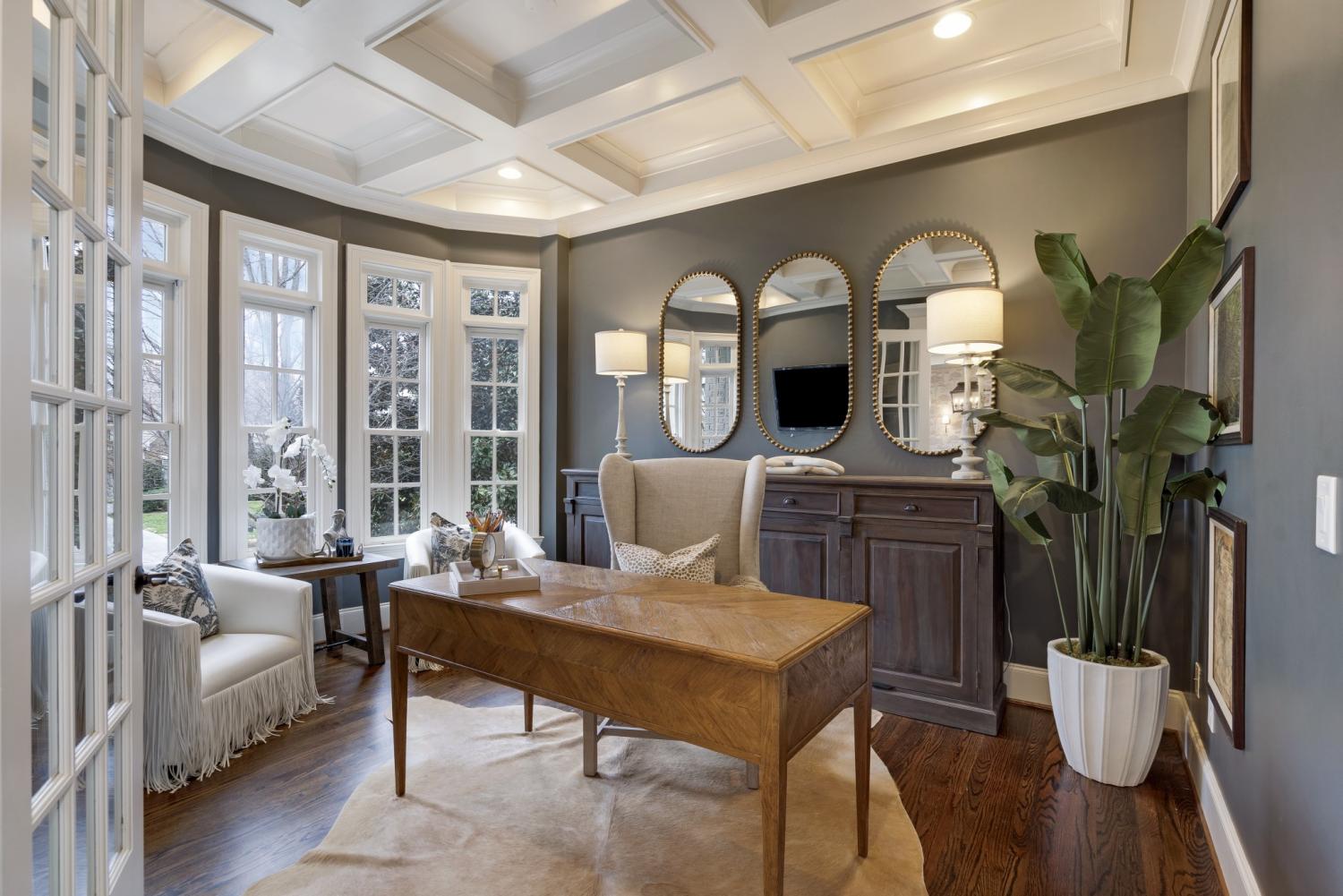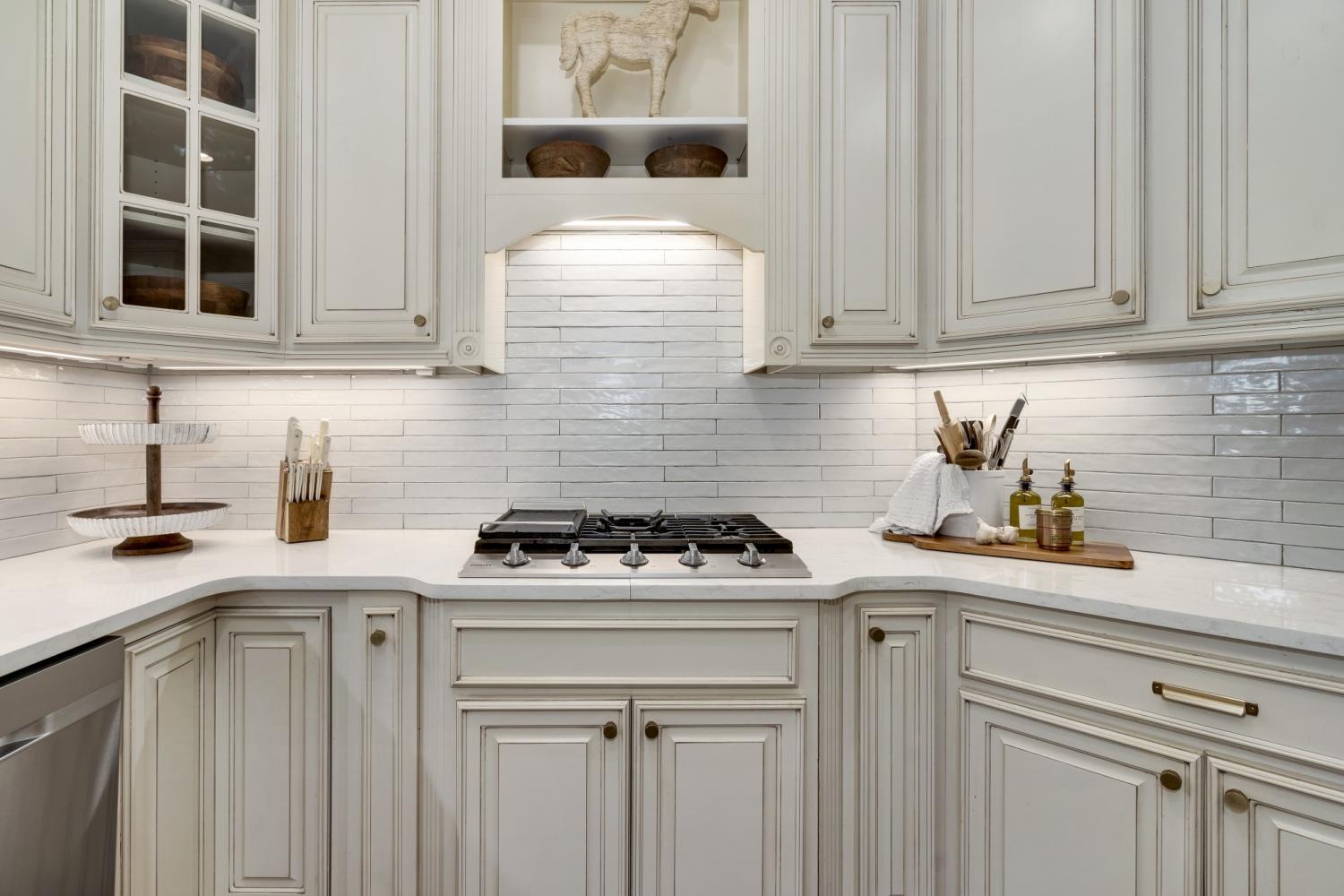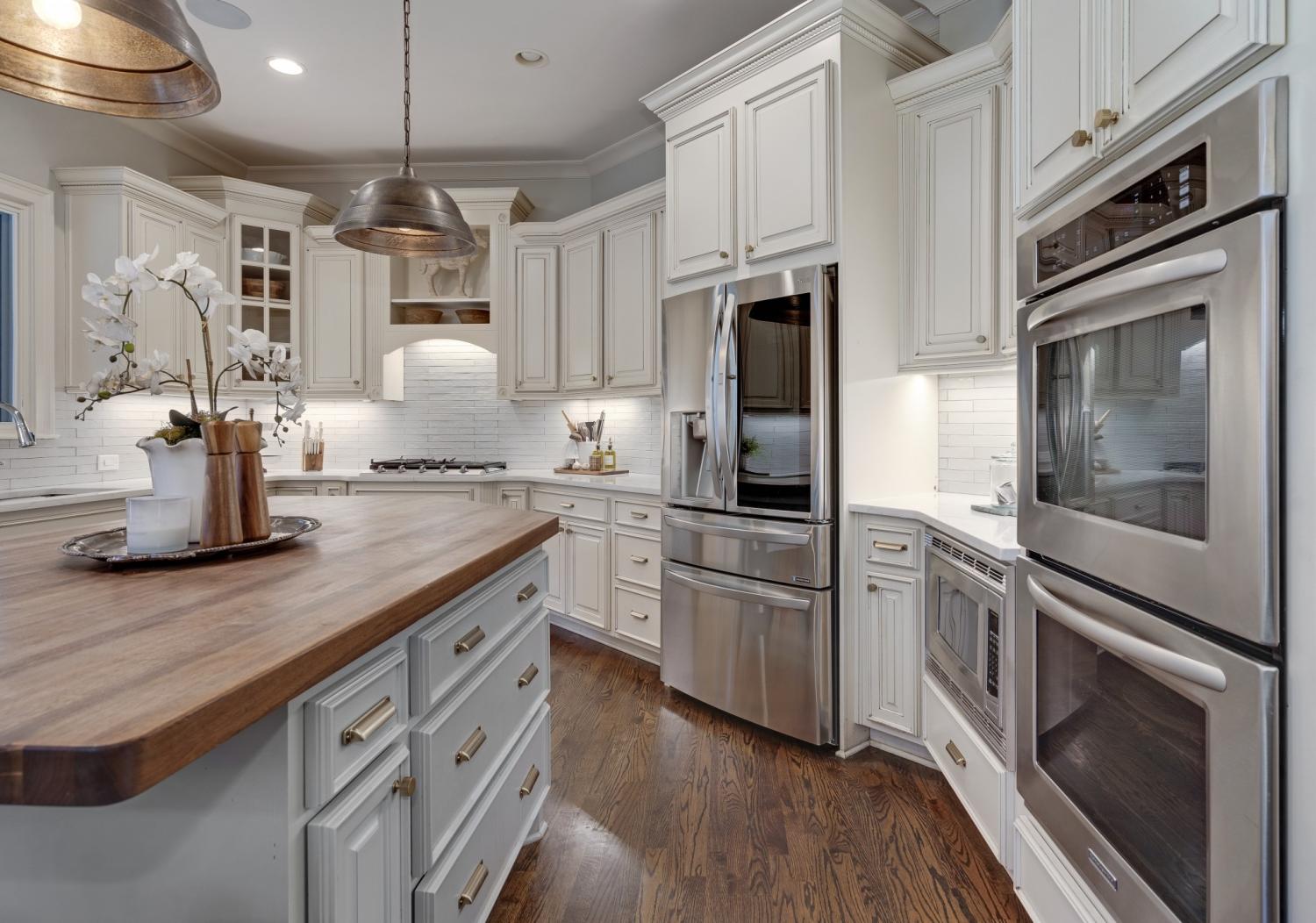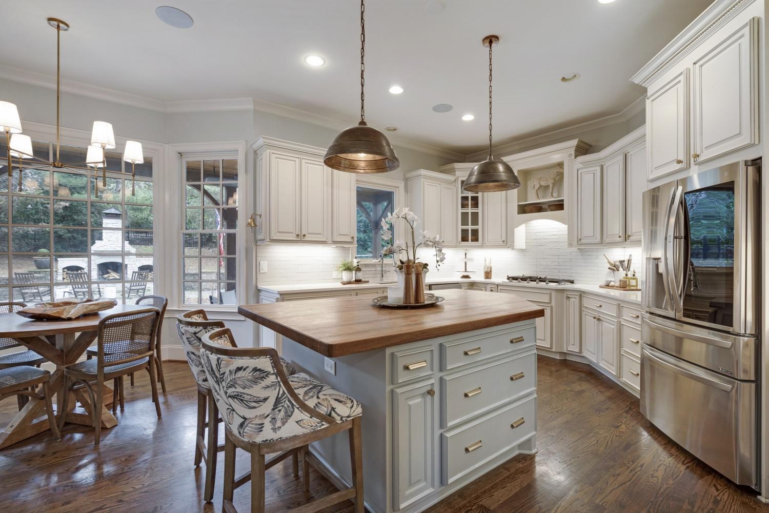 The spacious kitchen is designed for both beauty and function, featuring a five-burner gas range, butcher block island, and entertainer’s bar with beverage and wine refrigerators.